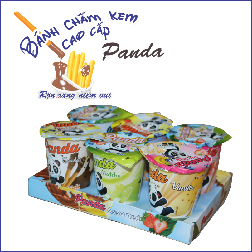 Bánh chấm kem mới Panda ngoài 3 vị Chocolate, Vani, Dâu truyền thống, nay đã có thêm 3 vị mới là: Matcha, Chuối và Việt Quất - Sự kết hợp giữa bánh quy dạng que và kem các vị trên đã tạo nên hương vị lôi cuốn!